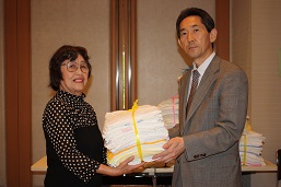 会員の代表の方から教頭先生へ400枚の雑巾が、手