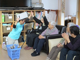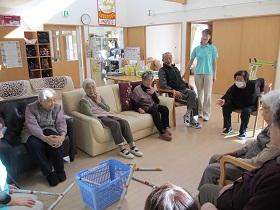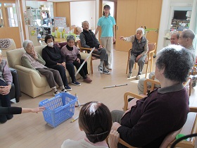 新聞紙で作った棒をカゴに投げ入れるというゲームです