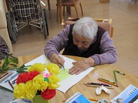あっついですね いくらか風は入りますが、室内温度27℃でした。 やっと夏らしくなってきましたね 今日のふたばの午前中です 七夕の笹を組立て中 ふたりで相談しながら作業をしていました。 たのしそう そのおとなりではスケッチ中 いくつも色を重ねてきれいに描かれていました。 貼り絵を楽しんでいる方も 色遣いが涼しそうでこちらもきれいです ゆっくりソファでくつろいでいる方、 外に出て日陰で涼んでいる方、 それぞれの過ごし方を楽しむ ふたばのひとときをお伝えしました では
